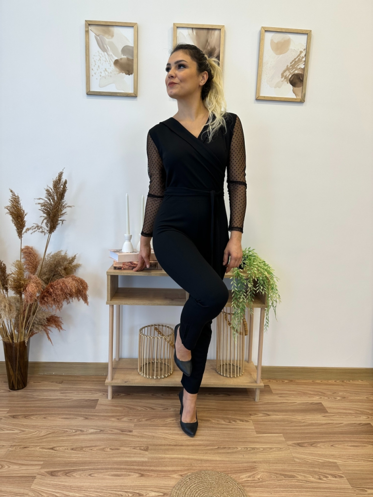 Kadın Uzun Kollu Kruvaze Yakalı Kolları Tül Detay Beli Kuşaklı Ithal Krep Tulum